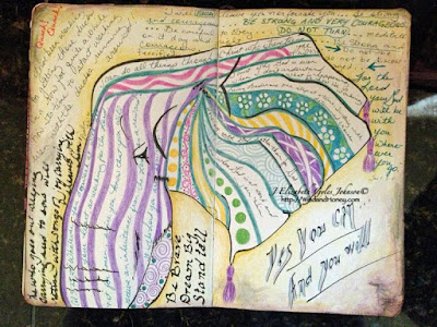 And these pages are the beginning. The elephant began with a compelling urge one day to draw an elephant. The colored designs came later and took days and days. I usually only journal for about 20 minutes at a time. And I do it as a part of my prayer life. Artist's pencils were used for everything on the page except the writing and the black outlines on the elephant. Those were done with various markers - Pitt and Sharpie colored pens. The background was done with watercolor pencils. I rarely use anything but various pencils in journal pages. I find it a challenge to get the looks I want using only pencils. If one is not trying to accomplish a fine art watercolor painting, watercolor pencils will do most of what you want on a journal page. And, frankly for me, it is about using what I have rather than investing in more supplies. The vase was drawn in graphite about a year ago. I'm not sure what was going on that day that I drew a wonky lopsided vase with flowers leaning the other direction. Freud would probably have a hay day with that! Just recently I've added the watercolor. This is very different than my usual style and I am really surprised at how much I like it.